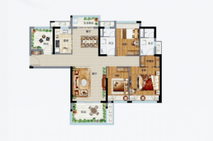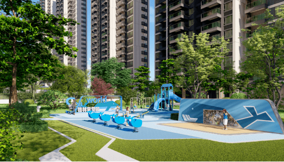 小區配套:全齡健康活動區(格林童夢園、頤樂康體區、青年能量場)、有氧跑道、親子遊泳池、景觀會客廳、七大主題架空層、叫車服務候車點、共享單車停放點