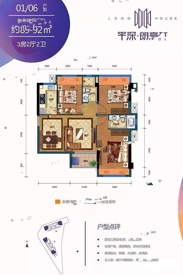 平深·朗豪軒項目位於中山板芙鎮深灣村順景工業區宏景一路9號,項目占地6384.4平方米,總建築面積19830.07平米,總住宅戶數180套,1幢住宅2-16層和2幢住宅2-17層共住宅面積13309.8平米,1幢與2幢底層商業1層和3幢商業3層共商業建築面積2115.31平米,地下室負1層建築面積4110.51平米,其他物業用房建築面積294.45平米。 平深·朗豪軒項目主推公攤面積少、戶型方正、贈送面積多、經濟實惠的兩梯六戶小戶型,分別是A戶型75平米兩房兩廳一衛一廚、B戶型89平米三房兩廳兩衛一廚、C戶型33平米一房一衛一廚,以及156㎡復式四房戶型。汽車車位數為地上35個,地下107個,摩托車位為地下140個,非機動車位為地上78個。 平深·朗豪軒采用了半圍合的布局,視野 開闊,前後都基本沒有遮擋,戶戶都可以遠眺項目旁的五桂山山脈,風景獨好的同時且居住舒適度高。小區整體采用現代簡約設計風格,所以整個外立面簡單而有特色,外立面還采用高級瓷磚鋪貼,經久耐用不褪色。